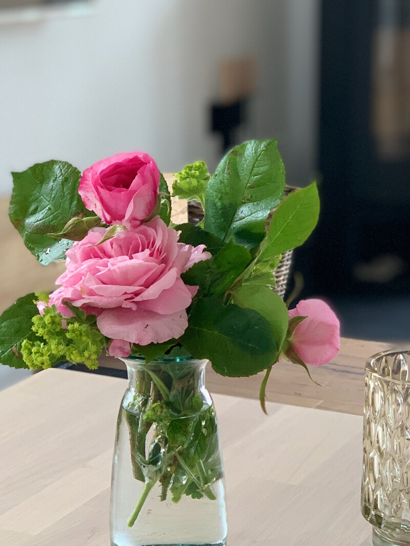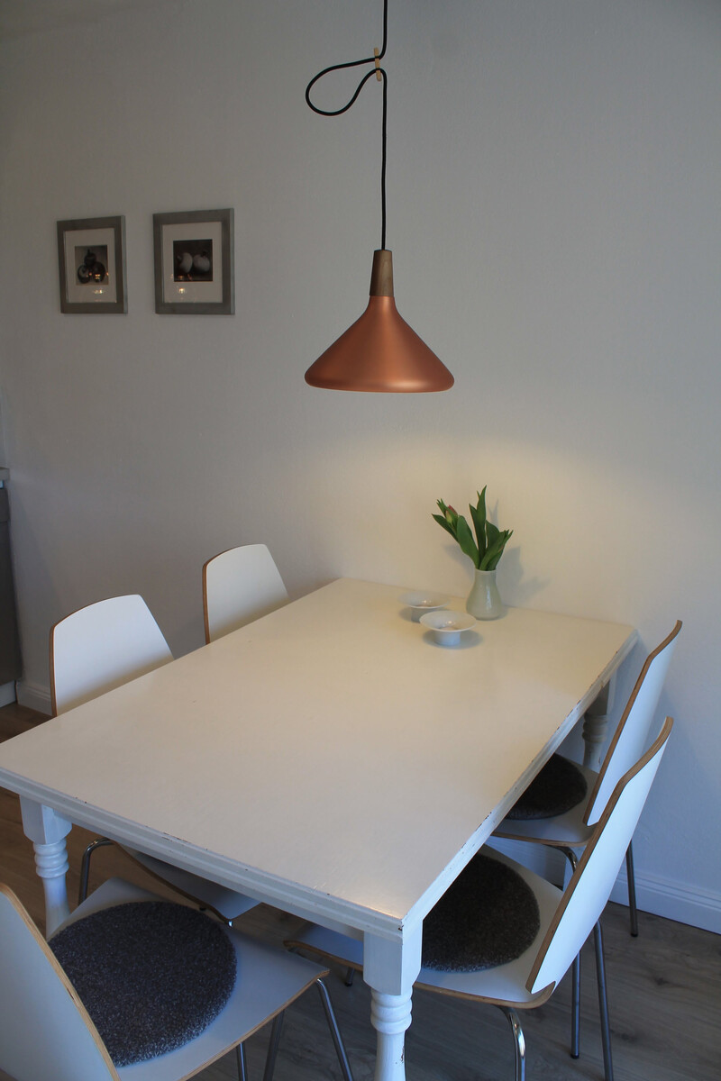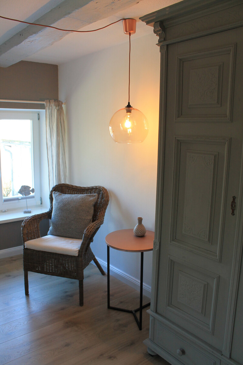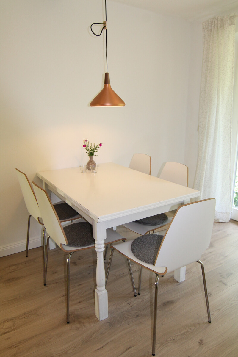 Die modern und nordisch schlicht eingerichtete 62 qm Wohnung mit freiliegenden Balken hat von allen Zimmern aus einen Blick in unseren Bauerngarten und ist damit sehr ruhig gelegen. Ein kleiner Balkon rundet diese Wohneinheit ab. Sie ist für 4 bis maximal 5 Personen geeignet. Die Wohnküche ist mit Lehmputz, der für ein gesundes und angenehmes Raumklima sorgt, und Wandstrahlungsheizung ausgestattet.