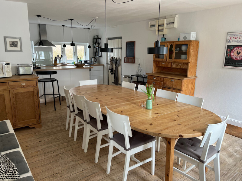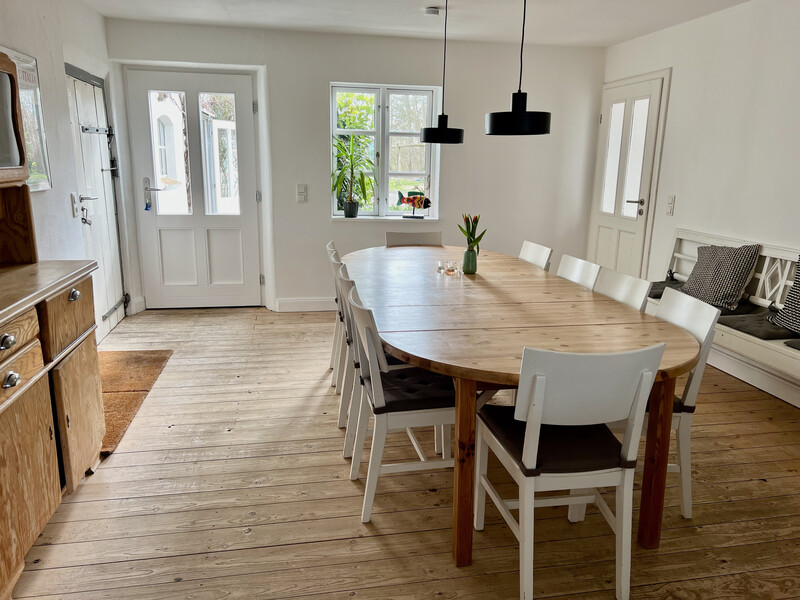 Ein Tisch für bis zu zwölf Personen bildet das Zentrum der Küche. Hier finden an kalten Tagen unsere gemütlichen Krabbenpul-, Eiergrog- und Weinabende statt. Die Küche ist als Gemeinschaftsküche zu verstehen und bietet daher Raum, um gemeinsam zu kochen und zu essen oder Spiele zu spielen und einfach beisammen zu sein. In einem kleinen Schrank neben dem Esstisch steht eine große Auswahl an Gesellschaftsspielen zur Verfügung. Wollt ihr mit eurem Laptop am großen Esstisch sitzen, habt ihr auch hier WLan Empfang.