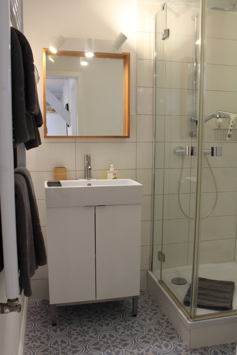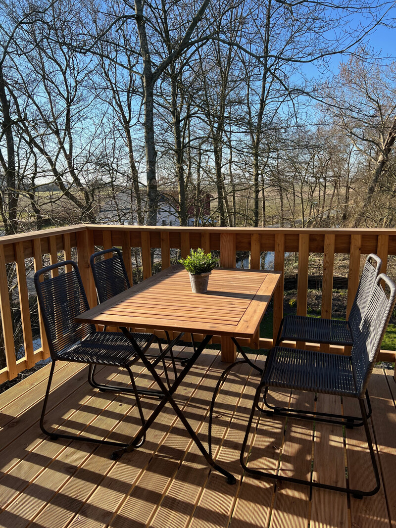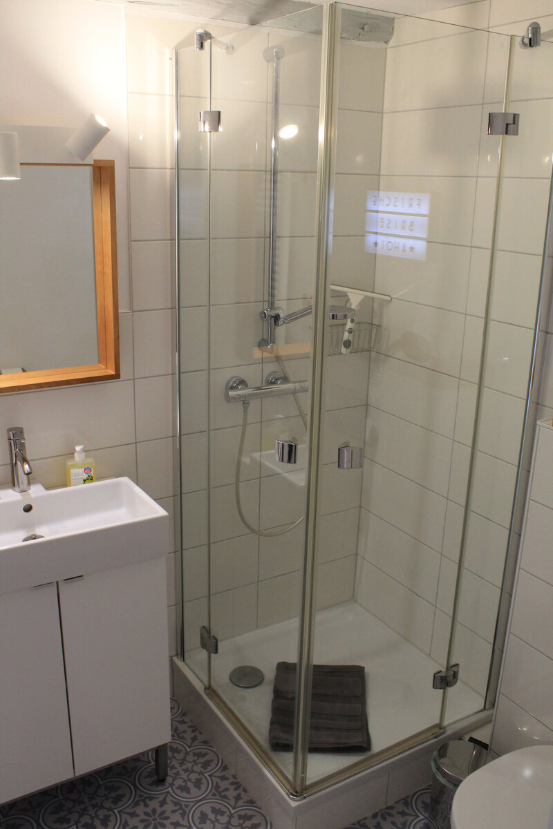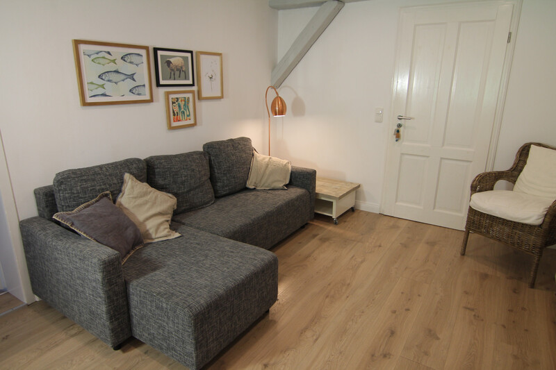 Die modern und nordisch schlicht eingerichtete 62 qm Wohnung mit freiliegenden Balken hat von allen Zimmern aus einen Blick in unseren Bauerngarten und ist damit sehr ruhig gelegen. Ein kleiner Balkon rundet diese Wohneinheit ab. Sie ist für 4 bis maximal 5 Personen geeignet. Die Wohnküche ist mit Lehmputz, der für ein gesundes und angenehmes Raumklima sorgt, und Wandstrahlungsheizung ausgestattet.