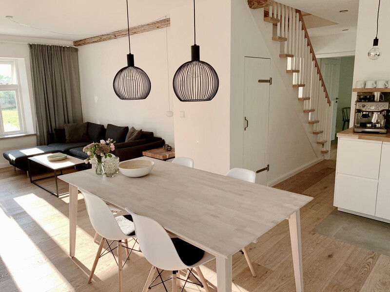 Das Haus bietet eine große voll ausgestattete Küche und ein großer Wohnessraum mit Kamin lässt alle zusammenkommen. Zudem bietet das Haus einen großen Garten mit Blick auf die umliegenden Felder. Zwei Terrassen und eine eigene Außensauna stehen zur Verfügung.